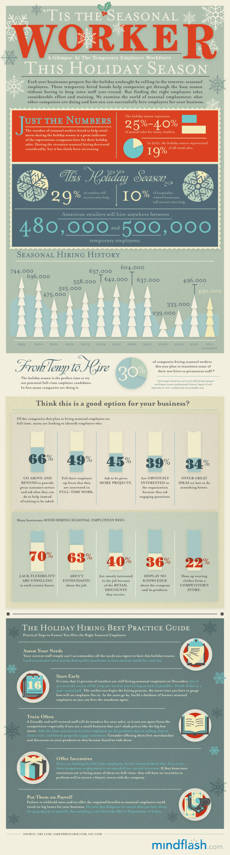 The best strategy for seasonal employment: check out what the other companies plan to do and model that for their hiring plans. This infographic from Mindflash.com can help shed some light on the landscape of seasonal temp workers.
