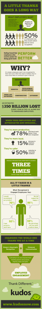 Taking a look at this infographic from Kudos and Visual.ly, it is interesting to note the scope of employee appreciation.