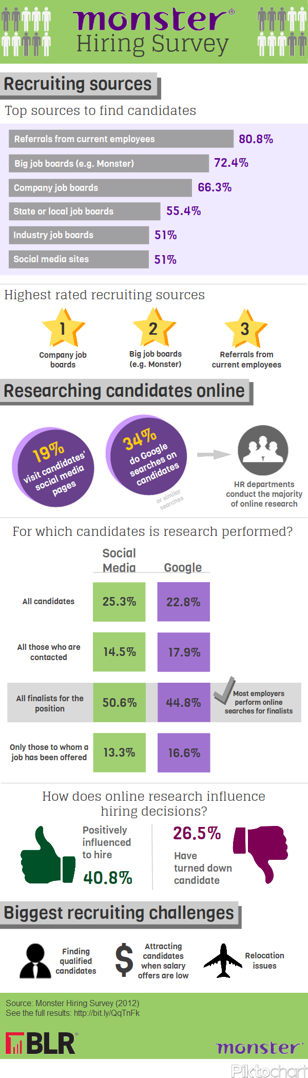 The infographic offers insight into recruiting sources, trends in researching candidates on online, including social media, and recruiting challenges human resources professionals.