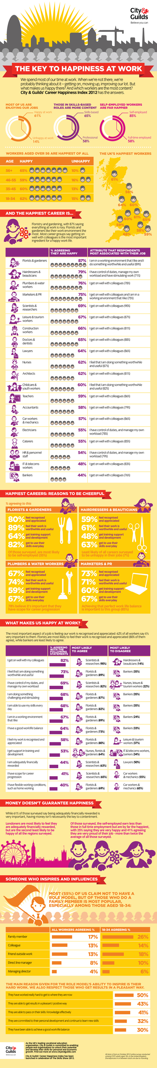 UK-based career site City & Guilds released this infographic of their 2012 Career Happiness Index, offering wide-ranging insights into what people regard as the most significant factors for joy at work.